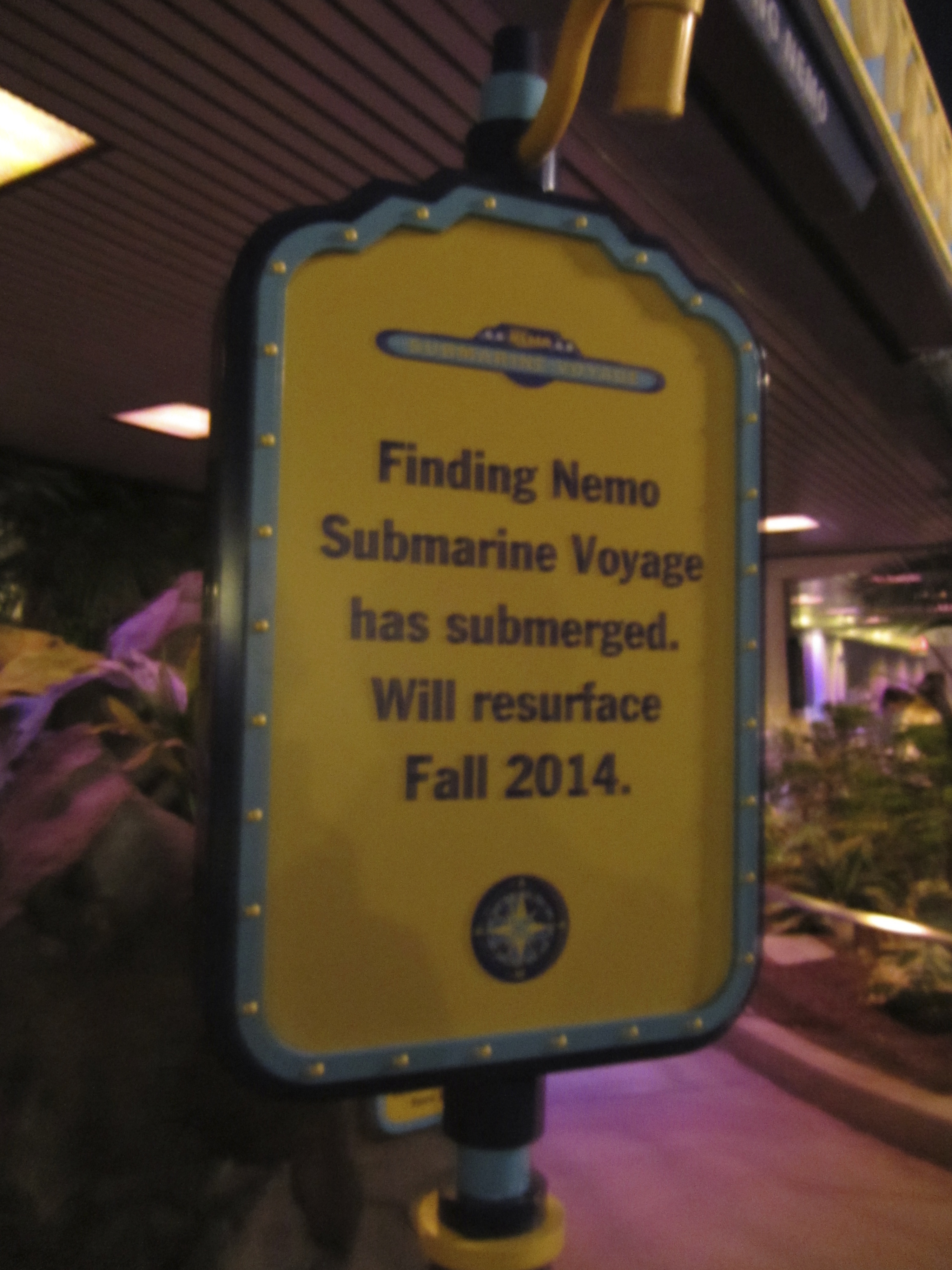 I apologize for the lousy quality of this picture, but I wanted to point out that Disney has doubled down and put up signs assuring guests that Finding Nemo Submarine Voyage will be back from refurbishment this fall, seemingly dispelling the rumor that they were going to quietly drop it off the refurbishment schedule and close it forever. Continue reading IMG_8186