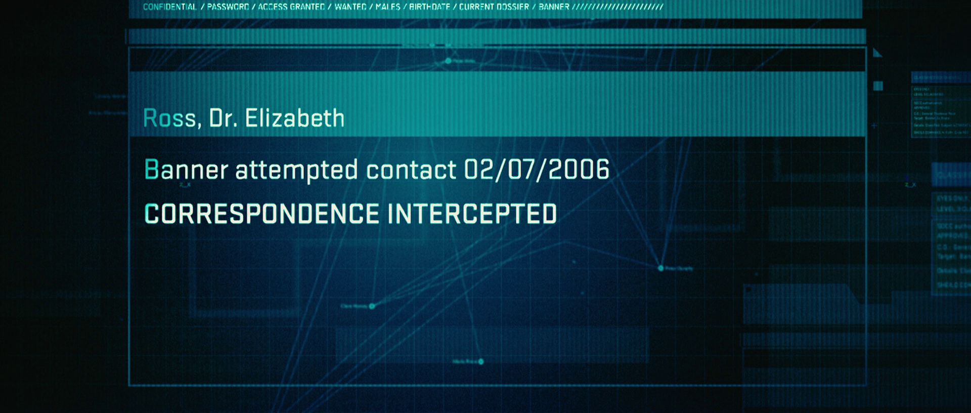 Right off the bat, beneath the opening credits, we get a ton of information thrown at us. None of it is definitive enough to firm up a real timeline, but it gives us a broad window for how long Banner has been on the run between the accident that created the Hulk and the start of the film. The earliest date is a night-vision photo reading April 18, 2004, and the most recent is a photo of a smashed car dated January 22, 2007, so we can assume that Banner has been dodging the United States army for at least three years. The two most significant pieces of information are the date Bruce last tried to contact Betty and the highlighted text saying there have been no sightings for five months. The five months number will come up again in just a minute.