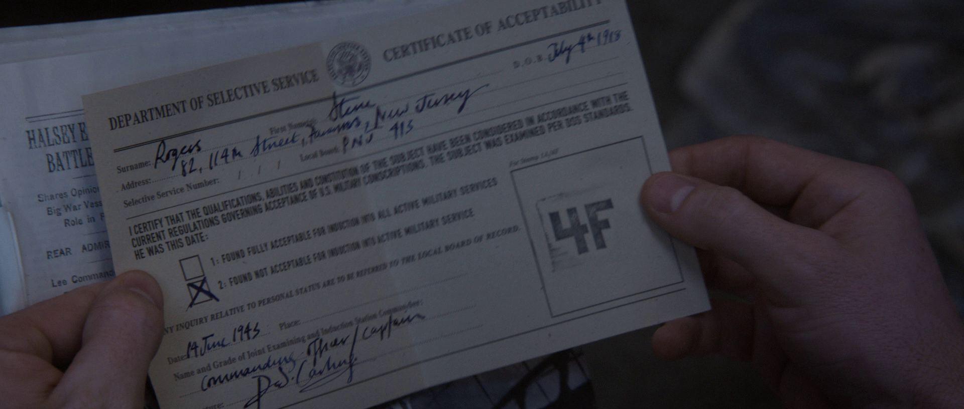 After one more time jump we get into the main body of the movie with Steve Rogers trying (again) to enlist in the armed forces only to (again) get turned down. We don’t know yet exactly when this is taking place, but we do see that Steve’s birthday is July 4, 1918.