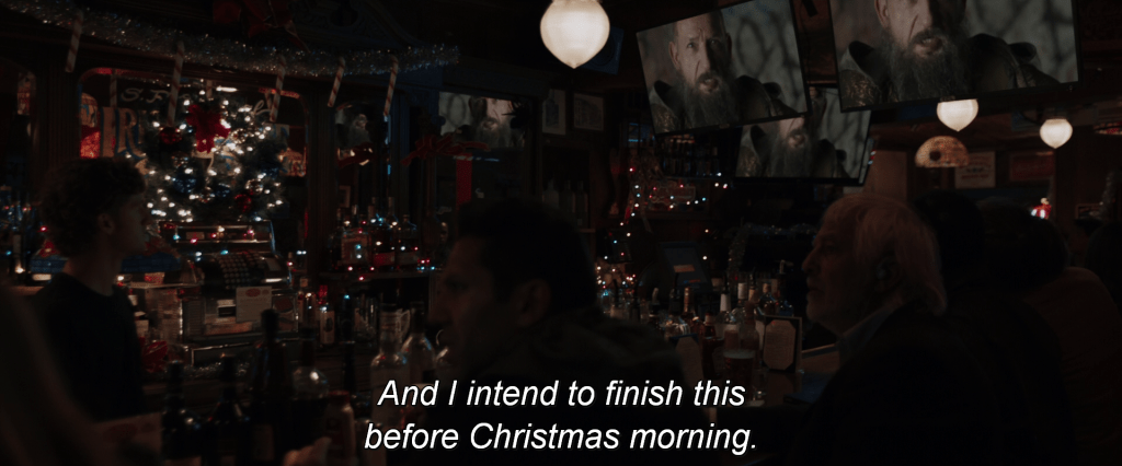 And yeah, this movie is set during the Holidays. The decorations in Tony’s garage are the first indicator of that, but like so many other Shane Black films, the Yuletide setting is obvious throughout the film. That said, I’m not going to catalog every instance of Holiday decor unless it’s tied to a specific date.
