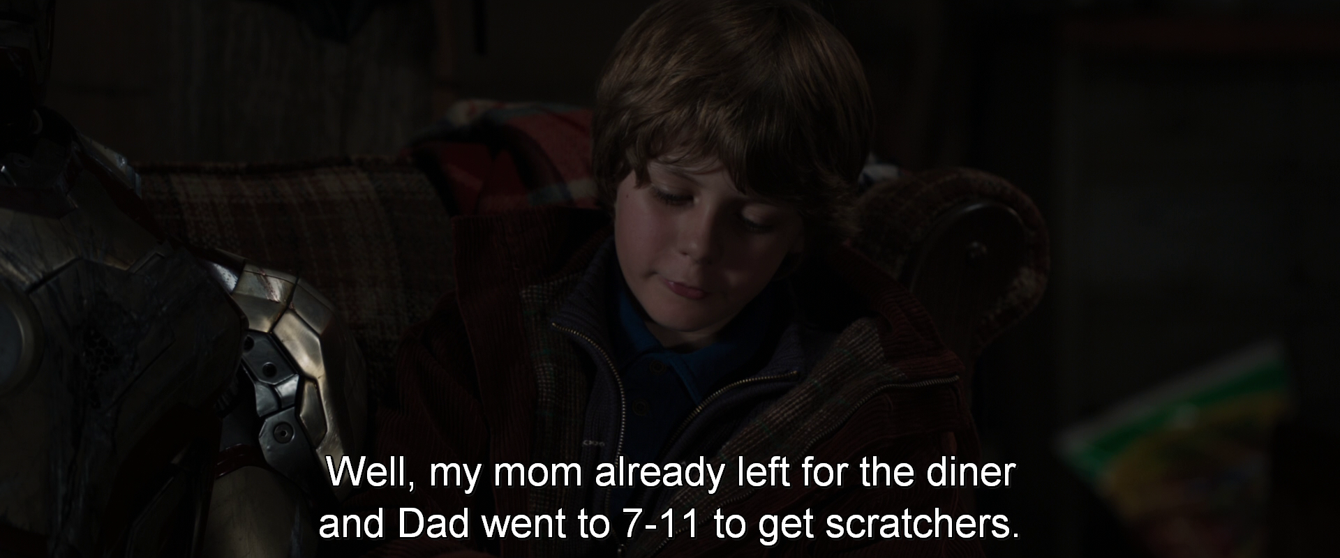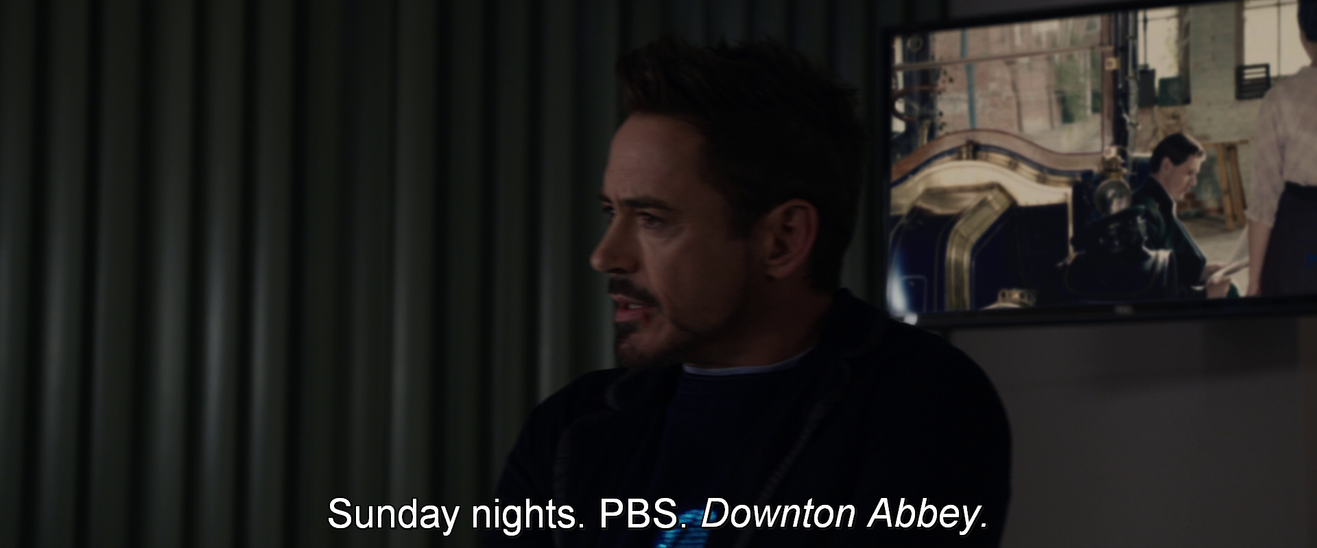 And now we have our year. These are the first of many references to the fact that the events of Iron Man Three take place thirteen years after the New Year’s Eve, 1999 prologue or, in other words, 2012. There’s also the throwaway gag about Downton Abbey which didn’t premiere in the U.S. until 2011. If the setting of this was a little more vague, I could make up some nonsense about how maybe in that universe, Downton Abbey got made a few years early, but as it stands, it only corroborates the overwhelming evidence that this film is set in 2012.