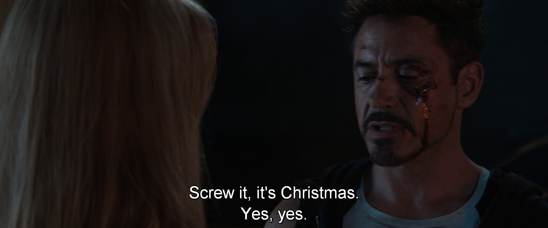 And here’s our first overt reference to the events of Iron Man Three taking place after The Avengers. There are other indicators earlier than this, specifically the presence of the Mark VII armor that debuted in Marvel’s big team-up event, but this one’s significant because it deals specifically with Tony’s anxiety disorder in the aftermath of that film. It’d be a lot easier on my timeline if we could just assume that Iron Man Three took place a few years after The Avengers, but though never made explicit, there’s an implicit immediacy to Tony’s breakdown where months of stress and anxiety are finally coming to a head and he’s forced to confront it. The obvious intention was that Iron Man Three is set during Christmas of that same year.
