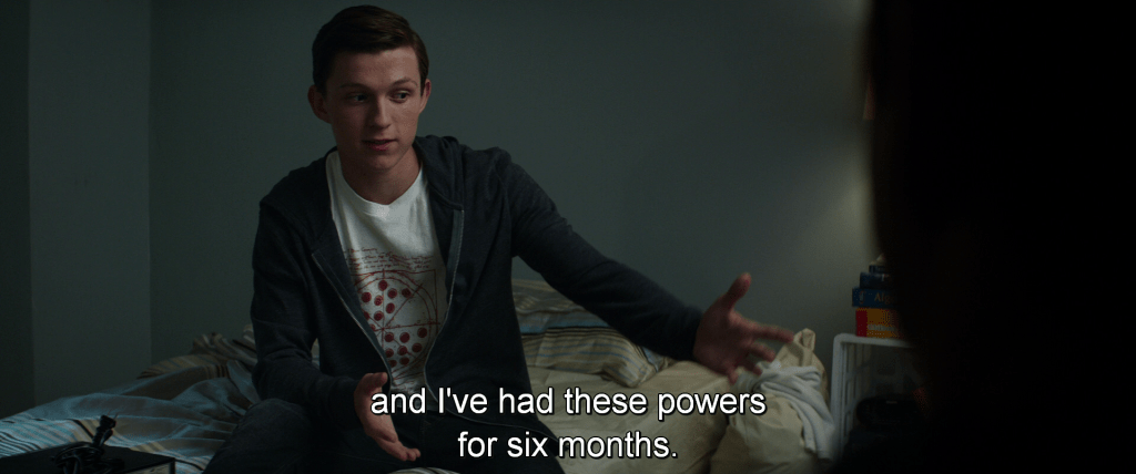 Peter Parker has had his powers for six months by this point, and if we’re assuming this is somewhere around April of 2017, that would put his fateful spider bite somewhere around October of 2016. This shouldn’t cause any conflicts since this is our first time meeting the kid (don’t @ me about Iron Man 2), but someone’s likely to point out the oblique Spidey reference at the end of Ant-Man. I mean, sure, nothing in that movie firmly establishes its place on the timeline beyond vaguely after Age of Ultron, so we could move it up to 2016, but I don’t feel like that’s really necessary for a reference that’s specifically intended to mean more to the audience than it is to any of the characters in the story. We, the audience, are intended to hear “guys who climb up walls” and think “Spider-Man!” but he’s hardly the only comic book character who can climb things.