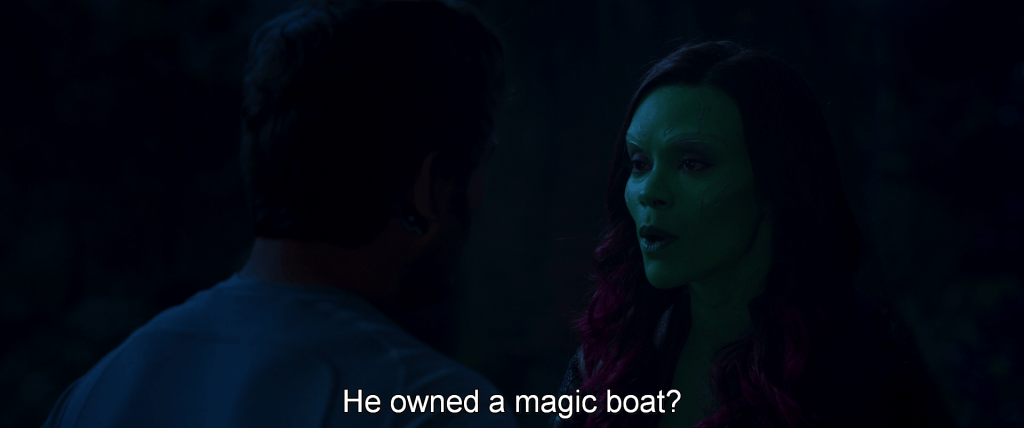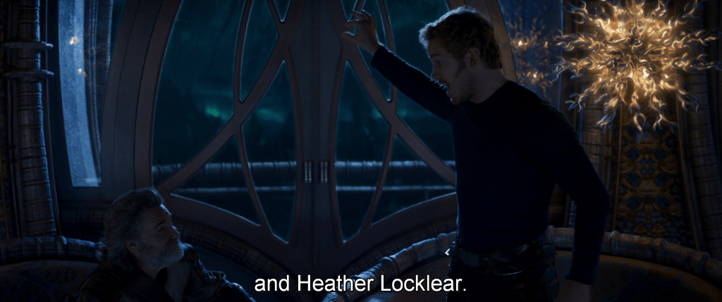 Finally there’s Cheap Trick’s 1978 song “Surrender.” This one almost doesn’t seem diegetic as it plays over the start of the credits, but it then transitions into the first of the film’s many credits sequences where it plays underneath Kraglin learning to use Yondu’s arrow (the subtitle appears way before any of that, though, so you’re getting a black screen with this one. Sorry).